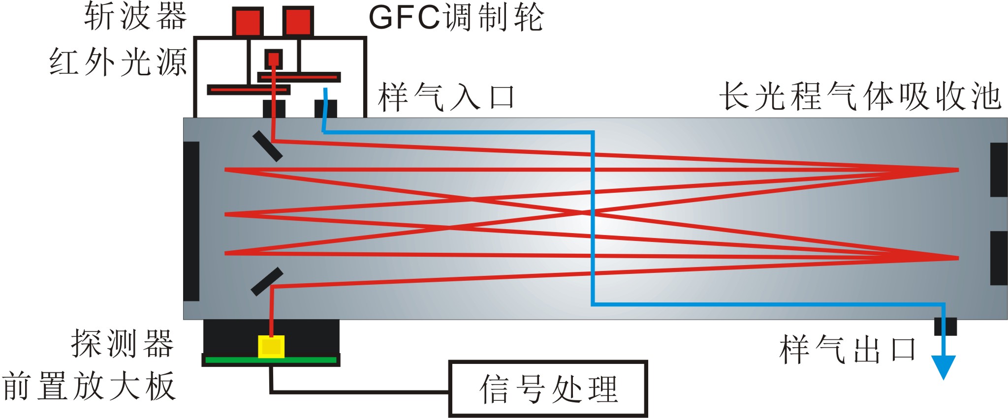 光源發(fā)出的紅外光經(jīng)GFC調(diào)制輪交替進(jìn)入氣體池,一路被充滿待測(cè)氣體的氣泡所吸收,一路穿過(guò)完全不含待測(cè)氣體的氣泡兩路光分別經(jīng)透鏡匯聚后由紅外探測(cè)器接收,經(jīng)過(guò)信號(hào)處理得到測(cè)量信號(hào)和參考信號(hào)。通過(guò)對(duì)兩路信號(hào)進(jìn)行分析,可以得出氣體中相關(guān)組分的濃度。